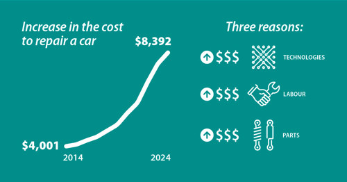 In 2014, the cost to repair a car after a collision was $4,001. In 2024, this cost was $8,392, i.e., a 110% increase. Such an increase inevitably has an impact on the cost of car insurance.